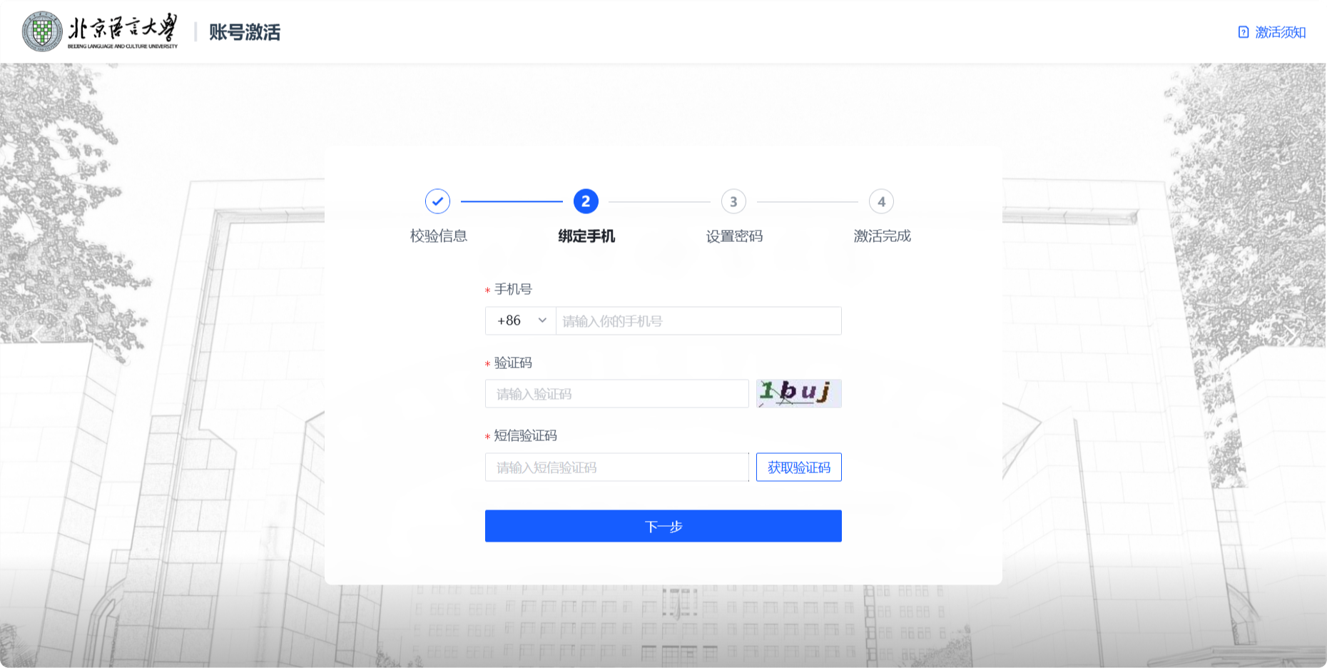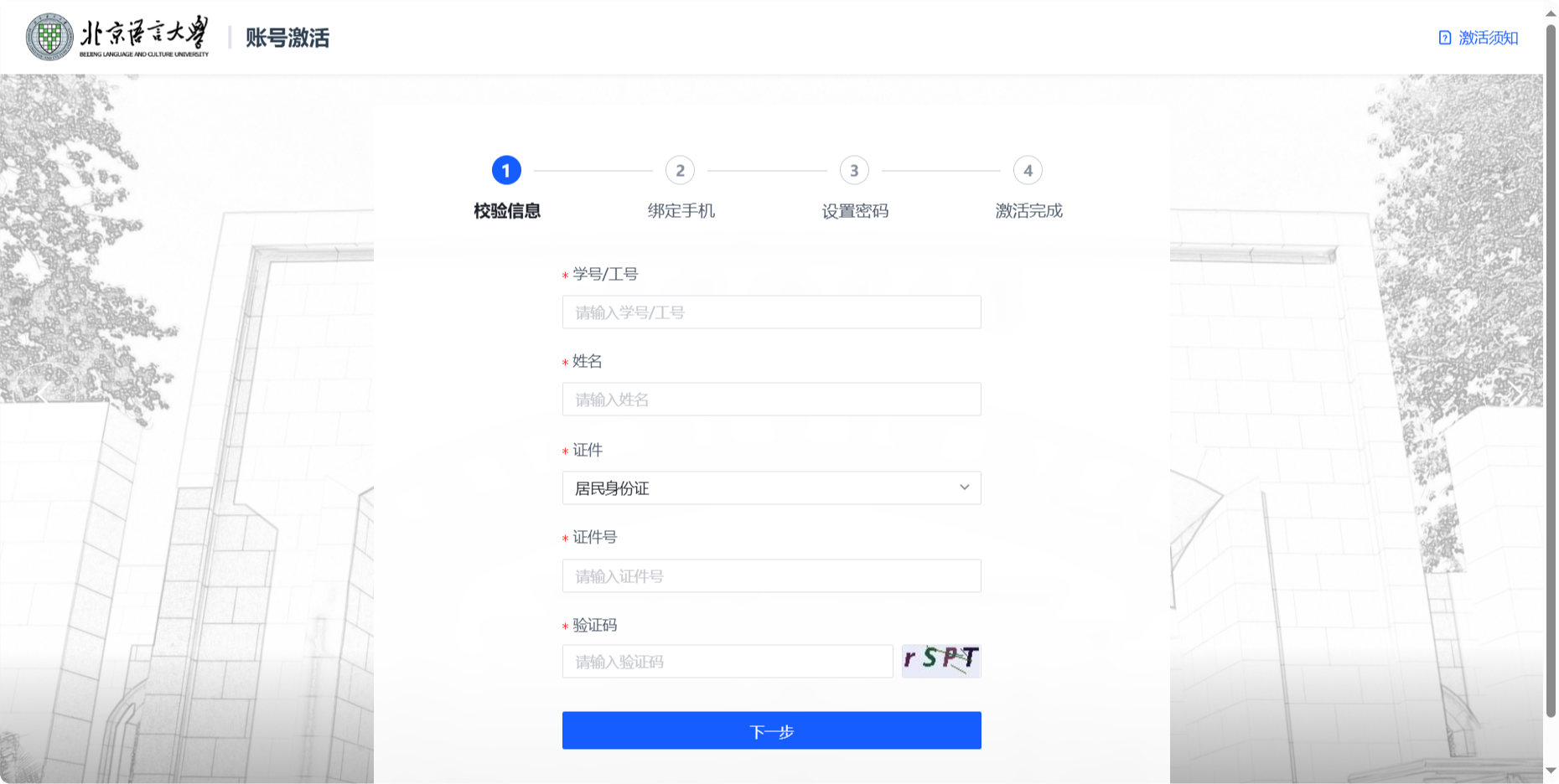 按照页面提示输入学号/工号、姓名、证件类型、证件号码及页面验证码信息,完成后点击下一步。