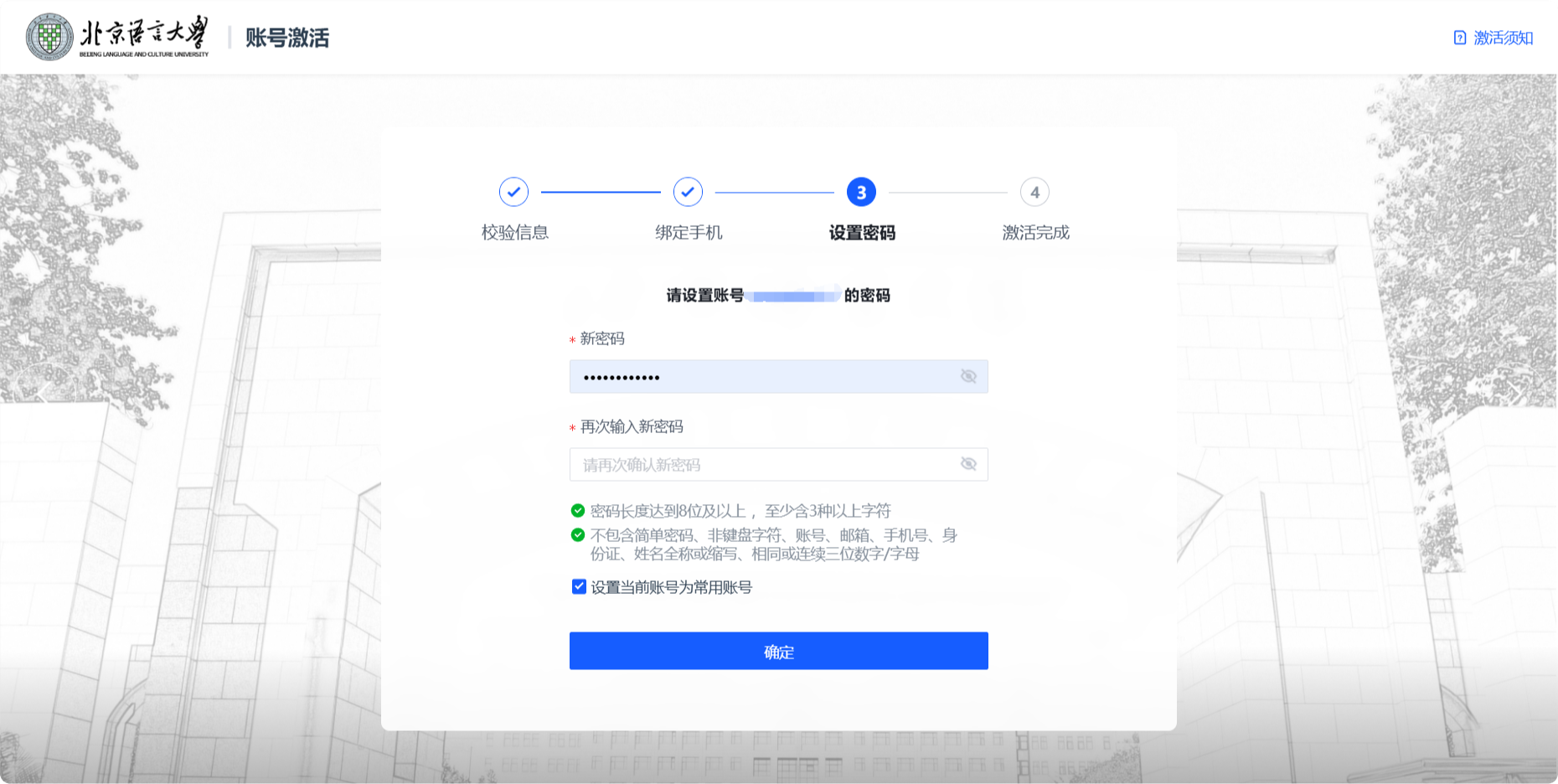 首次使用统一身份认证平台的师生,需要进行账号激活,在激活过程中自助设置密码。