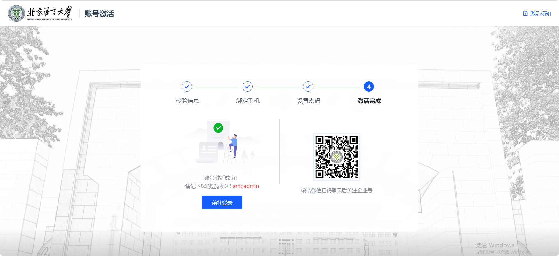 激活完成,请扫描二维码登录后,完成企业微信关注。后续即可通过微信扫码进行登录。