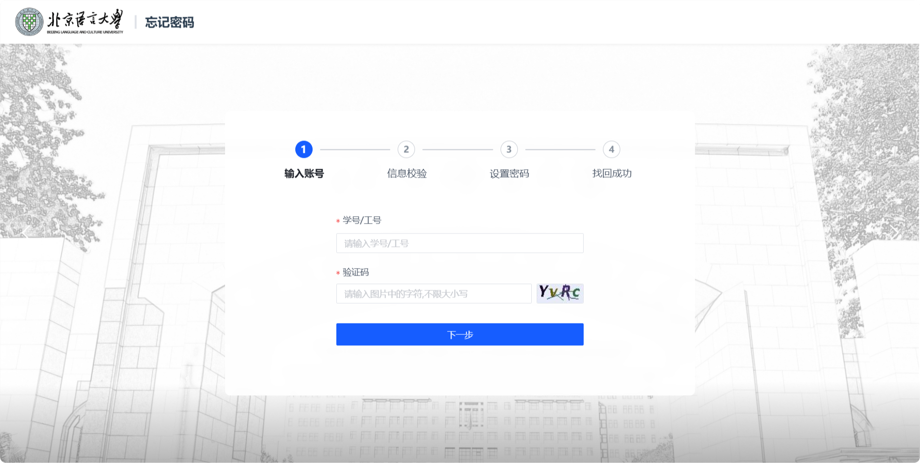 按照提示输入学号或工号,填入验证码后点击下一步